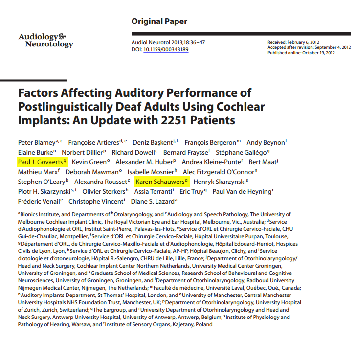 In het wetenschappelijke toptijdschrift Audiology & Neurotology verschijnt een bijdrage van Dr. Blamey et al. over de resultaten van cochleaire implantatie van 2002 tot 2011.